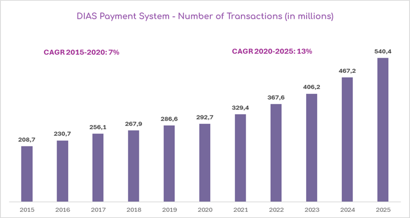The evolution of transaction volumes processed through the DIAS Payment System reflects a steady growth trajectory, which has significantly strengthened and accelerated over the past five years.