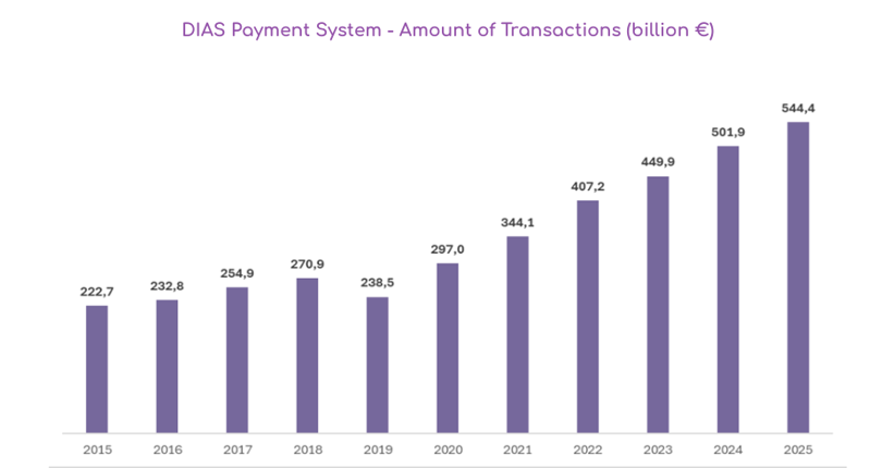 Alongside the increase in transaction volumes, 2025 also recorded a strong rise in the value of transactions processed through the DIAS Payment System. The total transaction value reached €544.4 billion, marking a new historical high.